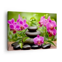 Cuadro sobre lienzo - Impresión de Imagen - Orquídeas rosas con piedras sobre un fondo verde. - 70x50cm - Una pirámide de paz - Decoración de pared moderna para salón y dormitorio ARTTOR