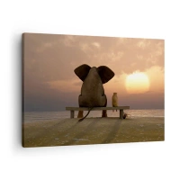 Cuadro sobre lienzo - Impresión de Imagen - Un elefante y un perro están sentados en un banco en la playa durante el atardecer. - 70x50cm - Es bueno estar en silencio juntos - Decoración de pared moderna para salón y dormitorio ARTTOR