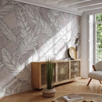 Fotomural Premium Sand - Hojas de plátano en blanco y negro sobre un fondo beige - 100x70cm - Turbulencias de plumas - Decoración de pared moderna para salón y dormitorio ARTTOR