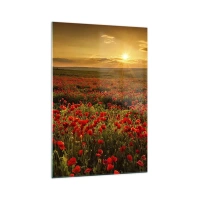 Cuadro sobre vidrio - Impresiones sobre Vidrio - Un campo de amapolas rojas bajo el resplandor del sol poniente. - 70x100cm - Entre los campos de flores - Decoración de pared moderna para salón y dormitorio ARTTOR