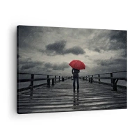 Cuadro sobre lienzo - Impresión de Imagen - Una persona con un paraguas rojo en un muelle lluvioso. - 120x50cm - No importa que llueva - Decoración de pared moderna para salón y dormitorio ARTTOR