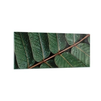 Cuadro sobre vidrio - Impresiones sobre Vidrio - Fotografía macro de hojas verdes con gotas de rocío. - 120x50cm - En un ritmo verde - Decoración de pared moderna para salón y dormitorio ARTTOR