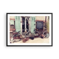Póster en marco negro - Bicicletas antiguas frente a una puerta de madera con contraventanas en tonos pastel. - 70x50cm - La vida rural - Decoración de pared moderna para salón y dormitorio ARTTOR