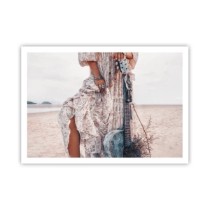 Póster - Mujer de estilo boho con guitarra en la playa - 100x70cm - Una flor en el camino - Decoración de pared moderna para salón y dormitorio ARTTOR