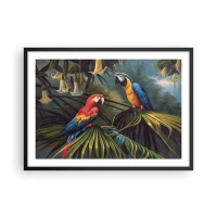 Póster en marco negro - Loros en un bosque tropical con flores exóticas al fondo. - 70x50cm - Romanticismo en los trópicos - Decoración de pared moderna para salón y dormitorio ARTTOR