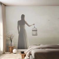 Fotomural Premium Sand - Sé libre - Mujer, Jaula de pájaros, Pájaro - 200x140 cm
