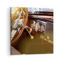 Cuadro sobre vidrio - Impresiones sobre Vidrio - Primer plano del interior de un coche clásico con detalles en madera y cromo. - 70x100cm - Un soplo de lujo del pasado - Decoración de pared moderna para salón y dormitorio ARTTOR