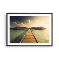 Póster en marco negro - Un embarcadero de madera que conduce a las casas sobre el agua, iluminadas por los rayos del sol. - 70x50cm - Una cálida invitación - Decoración de pared moderna para salón y dormitorio ARTTOR
