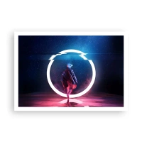 Póster en marco negro - Un personaje en un entorno futurista con un círculo de neón. - 100x70cm - Entre mundos - Decoración de pared moderna para salón y dormitorio ARTTOR