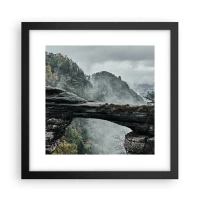 Reloj de pared - Reloj de vidrio - Un arco de piedra rodeado de montañas brumosas y bosques. - 30x30cm - La aventura está a punto de comenzar - Decoración de pared moderna para salón y dormitorio ARTTOR