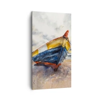 Cuadro sobre lienzo - Impresión de Imagen - Un pintoresco barco en la playa bajo un cielo nublado. - 120x50cm - Descansando en la orilla - Decoración de pared moderna para salón y dormitorio ARTTOR