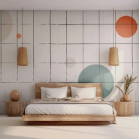 Fotomural Standard Eco - Círculos de colores sobre un fondo de una cuadrícula de líneas negras finas. - 100x70cm - Atrapados. ¿Nosotros o ellos? - Decoración de pared moderna para salón y dormitorio ARTTOR