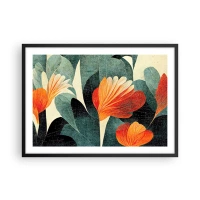 Póster en marco negro - Flores en tonos intensos de naranja y verde. - 70x50cm - El calor del trópico y el frescor del verdor - Decoración de pared moderna para salón y dormitorio ARTTOR