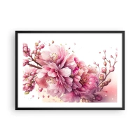 Póster en marco negro - Delicadas flores de cerezo en plena floración sobre un fondo claro. - 70x50cm - Flor de cerezo - Decoración de pared moderna para salón y dormitorio ARTTOR