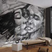 Fotomural Standard Eco - Boceto en blanco y negro de dos caras besándose. - 100x70cm - Un momento tierno - Decoración de pared moderna para salón y dormitorio ARTTOR