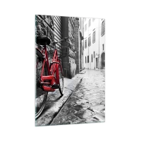 Cuadro sobre vidrio - Impresiones sobre Vidrio - Una bicicleta roja en una calle adoquinada con un fondo monocromático. - 50x70cm - La verdadera belleza no envejece - Decoración de pared moderna para salón y dormitorio ARTTOR