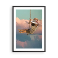 Póster en marco negro - Una mujer en un columpio entre nubes pastel. - 50x70cm - Jugando en las nubes - Decoración de pared moderna para salón y dormitorio ARTTOR