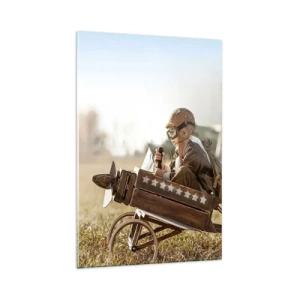 Cuadro sobre vidrio - Impresiones sobre Vidrio - Un niño en un avión de juguete con un campo al fondo. - 80x120cm - Despegue hacia un sueño - Decoración de pared moderna para salón y dormitorio ARTTOR