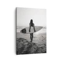 Cuadro sobre lienzo - Impresión de Imagen - Mujer con tabla de surf en la playa en blanco y negro - 80x120cm - Hija de las olas marinas - Decoración de pared moderna para salón y dormitorio ARTTOR