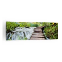 Cuadro sobre lienzo - Impresión de Imagen - Un puente de madera sobre una cascada rodeado de un exuberante bosque verde. - 160x50cm - No es agua silenciosa en absoluto - Decoración de pared moderna para salón y dormitorio ARTTOR