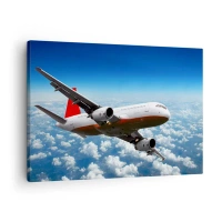 Fotomural Premium Canvas - Un avión de pasajeros volando sobre las nubes contra un cielo azul. - 100x70cm - Aléjese de todo - Decoración de pared moderna para salón y dormitorio ARTTOR