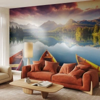 Fotomural Premium Canvas - Tres barcos de madera con el telón de fondo de un lago de montaña al atardecer - 100x70cm - Frente a la naturaleza - Decoración de pared moderna para salón y dormitorio ARTTOR