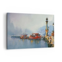 Cuadro sobre lienzo - Impresión de Imagen - Un puerto con barcos rojos rodeado de un paisaje brumoso. - 120x80cm - En el fin del mundo - Decoración de pared moderna para salón y dormitorio ARTTOR