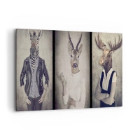 Cuadro sobre lienzo - Impresión de Imagen - Un tríptico con figuras de animales con ropa humana sobre un fondo artístico. - 120x80cm - Que los gestos hablen - Decoración de pared moderna para salón y dormitorio ARTTOR