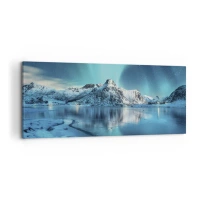 Cuadro sobre lienzo - Impresión de Imagen - Aurora boreal sobre montañas nevadas y un lago - 120x50cm - Una noche de luz - Decoración de pared moderna para salón y dormitorio ARTTOR