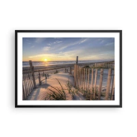Póster en marco negro - Playa al atardecer con valla de madera - 70x50cm - El resplandor y la sombra del viento - Decoración de pared moderna para salón y dormitorio ARTTOR