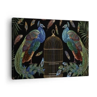 Cuadro sobre lienzo - Impresión de Imagen - Pavos reales junto a una jaula dorada sobre un fondo negro - 70x50cm - Con plumajes reales - Decoración de pared moderna para salón y dormitorio ARTTOR