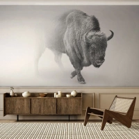 Fotomural Premium Sand - Una imagen en blanco y negro de un bisonte rodeado de niebla. - 100x70cm - Rey de la pradera - Decoración de pared moderna para salón y dormitorio ARTTOR