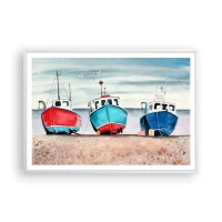 Póster - Coloridos barcos de pesca en la orilla en un paisaje marino - 100x70cm - Listos para la pesca - Decoración de pared moderna para salón y dormitorio ARTTOR