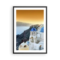Póster en marco negro - Santorini con sus casas blancas y cúpulas azules - 50x70cm - Santorini - el abrazo a las rocas - Decoración de pared moderna para salón y dormitorio ARTTOR