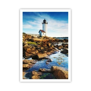 Cuadro sobre lienzo - Impresión de Imagen - Un faro en una costa rocosa en un día soleado. - 70x100cm - Esperando vuestro regreso - Decoración de pared moderna para salón y dormitorio ARTTOR
