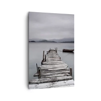 Cuadro sobre lienzo - Impresión de Imagen - Un puente de madera que conduce a la tranquila superficie del lago. - 80x120cm - Mañana partimos - Decoración de pared moderna para salón y dormitorio ARTTOR