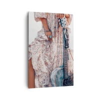 Cuadro sobre lienzo - Impresión de Imagen - Mujer de estilo boho con guitarra en la playa - 80x120cm - Una flor en el camino - Decoración de pared moderna para salón y dormitorio ARTTOR