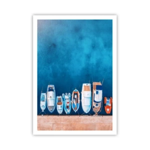 Cuadro sobre lienzo - Impresión de Imagen - Barcos amarrados en la orilla contra el agua azul. - 70x100cm - En fila y a la espera - Decoración de pared moderna para salón y dormitorio ARTTOR