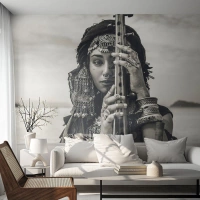 Fotomural Premium Canvas - Retrato de una mujer con joyas étnicas sosteniendo un instrumento en la mano. - 100x70cm - La música propia de Oriente - Decoración de pared moderna para salón y dormitorio ARTTOR