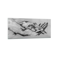 Cuadro sobre vidrio - Impresiones sobre Vidrio - Una composición en blanco y negro de dos manos entrelazadas sobre un fondo claro. - 120x50cm - El comienzo... - Decoración de pared moderna para salón y dormitorio ARTTOR