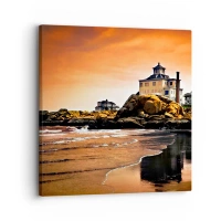Cuadro sobre lienzo - Impresión de Imagen - Una casa sobre una roca junto a la playa al atardecer con su reflejo en el agua. - 70x50cm - La elegancia de la costa oeste - Decoración de pared moderna para salón y dormitorio ARTTOR