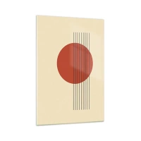 Cuadro sobre vidrio - Impresiones sobre Vidrio - Círculo rojo abstracto con líneas sobre fondo beige. - 80x120cm - Cruzando el círculo - Decoración de pared moderna para salón y dormitorio ARTTOR