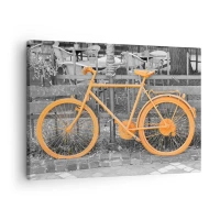 Cuadro sobre vidrio - Impresiones sobre Vidrio - Una ilustración de una bicicleta pintada de color naranja sobre un fondo blanco y negro. - 70x50cm - Sigue, yo esperaré aquí - Decoración de pared moderna para salón y dormitorio ARTTOR