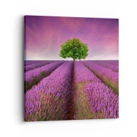 Cuadro sobre lienzo - Impresión de Imagen - Un campo de lavanda con un árbol solitario y un cielo púrpura. - 70x50cm - En los campos de lavanda - Decoración de pared moderna para salón y dormitorio ARTTOR