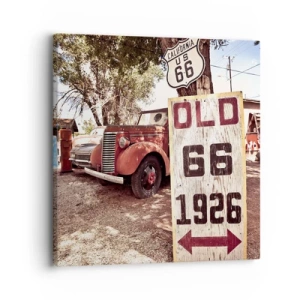 Cuadro sobre lienzo - Impresión de Imagen - Coche retro y cartel de la Ruta 66 en un entorno rústico - 50x70cm - Una leyenda de la América profunda - Decoración de pared moderna para salón y dormitorio ARTTOR