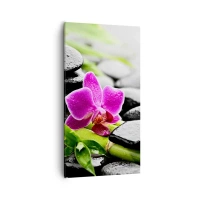 Cuadro sobre lienzo - Impresión de Imagen - Orquídea morada, piedras negras y bambú en una composición tranquila. - 80x120cm - En equilibrio pacífico - Decoración de pared moderna para salón y dormitorio ARTTOR