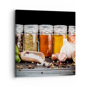 Cuadro sobre vidrio - Impresiones sobre Vidrio - Especias coloridas en frascos sobre un fondo oscuro - 50x70cm - Para que la vida sepa bien - Decoración de pared moderna para salón y dormitorio ARTTOR