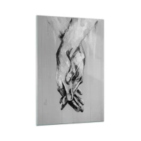 Cuadro sobre vidrio - Impresiones sobre Vidrio - Una composición en blanco y negro de dos manos entrelazadas sobre un fondo claro. - 80x120cm - El comienzo... - Decoración de pared moderna para salón y dormitorio ARTTOR