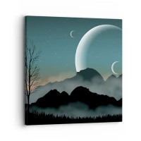 Cuadro sobre lienzo - Impresión de Imagen - Montañas brumosas con la luna y un árbol solitario. - 70x50cm - Un carnaval de noche estrellada - Decoración de pared moderna para salón y dormitorio ARTTOR