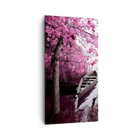 Cuadro sobre lienzo - Impresión de Imagen - Un barco en la orilla de un lago entre árboles rosados. - 80x120cm - En el silencio rosa - Decoración de pared moderna para salón y dormitorio ARTTOR